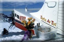 | Flowers, champagne and wedding gifts on the tail of an air taxi on the slopes of Mt. McKinley | ||||||||